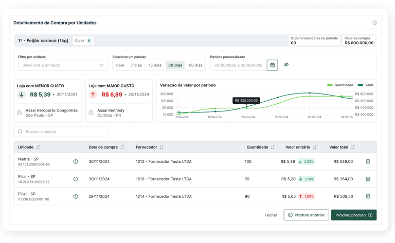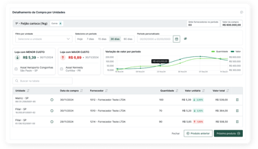 Tenha uma ferramenta que te permite negociar melhor com os seus fornecedores, conhecer o volume de compras e os preços de cada mercadoria.