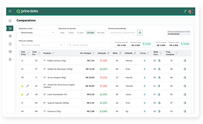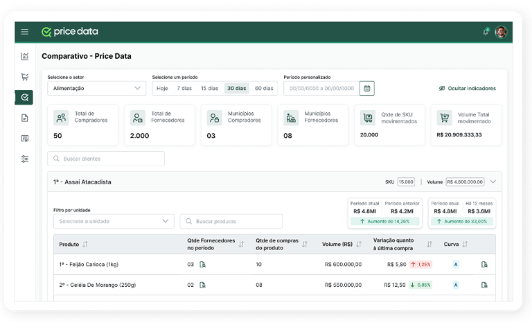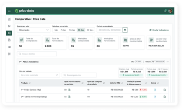 Compare preços, condições e desempenho de fornecedores de forma instantânea. Com o Price Data, você acompanha as variações de mercado em tempo real e garante decisões assertivas para maximizar a rentabilidade.